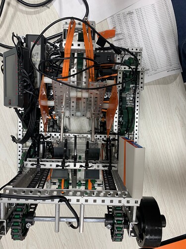 Adding onto everything else, some other small improvements that can be made, 12tooth gears normally arent the best for drive bases (friction issues, but also I used it on my worlds robot and it had amazing friction, just takes time to get right), and having all of your motors in the back means there are 5 gears that need to transfer power to the front wheel, I would recommend moving a motor closer to the front just so everything spins nicer with motors connected