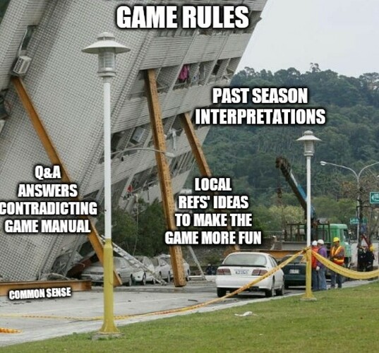 The biggest issue I have with these rulings is how the enforcement of the rules is dependent on the specific layout of the drive. The rules in the game manual should be applied equally to all robots, regardless of any design decisions. When you start enforcing rules differently based off of the design decisions of the robot, specific designs are either incentivized or discouraged. This particular ruling seems like it makes X drives a very poor choice, as x drives are traditionally not so great at climbing, so the average X drive probably has a hard time crossing the barrier. And on top of that, getting pinned as an X drive also doesn’t count as a pin, further hurting the merits of an X drive.